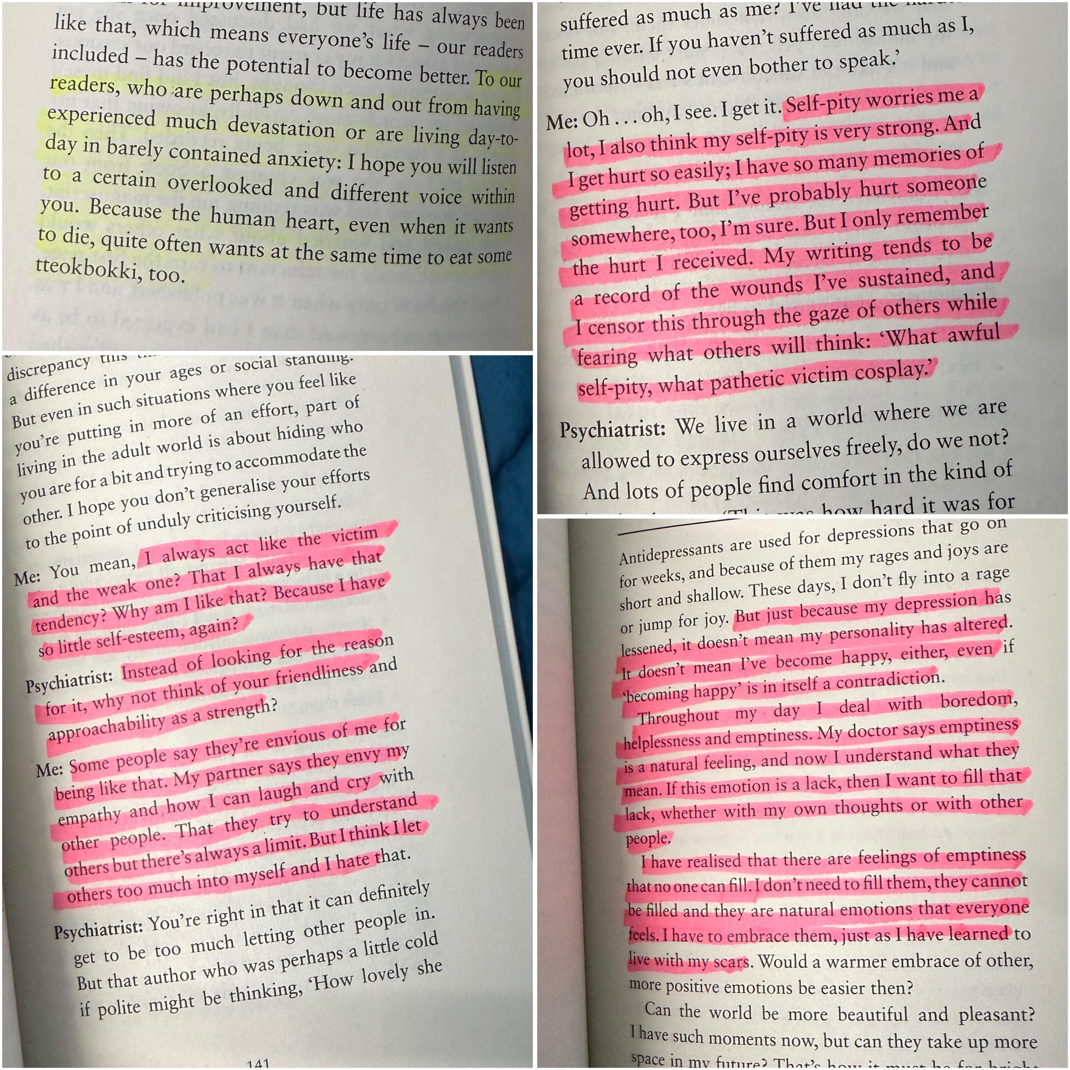 The book itself is hard to categorise, and I think that’s why it works. It’s not a memoir in the dramatic sense. Not self-help. Not a psychology textbook. It’s basically therapy sessions, recorded conversations between Sehee and her psychiatrist. The title…Wanting to die, but still wanting to eat.** Despair & appetite coexisting. Hopelessness and craving sitting next to each other. That contradiction felt very human to me.**